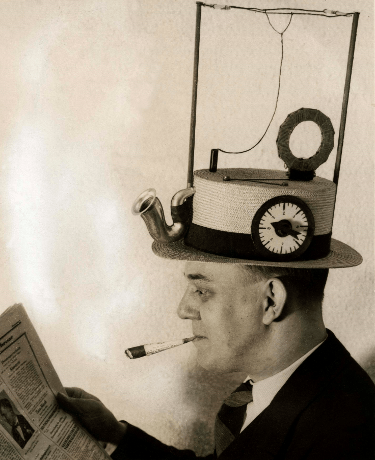 Dieses seltsame Gebilde ist eine Erfindung eines Berliner Ingenieurs aus den 1920er Jahren und erlaubt seinem Träger “ganz bequem während dem Golfen, Autofahren oder Angeln die Sonntagspredigt anzuhören“ – es handelt sich um einen normalen Herrenhut mit integriertem Radio, Antennen und Lautsprecher.