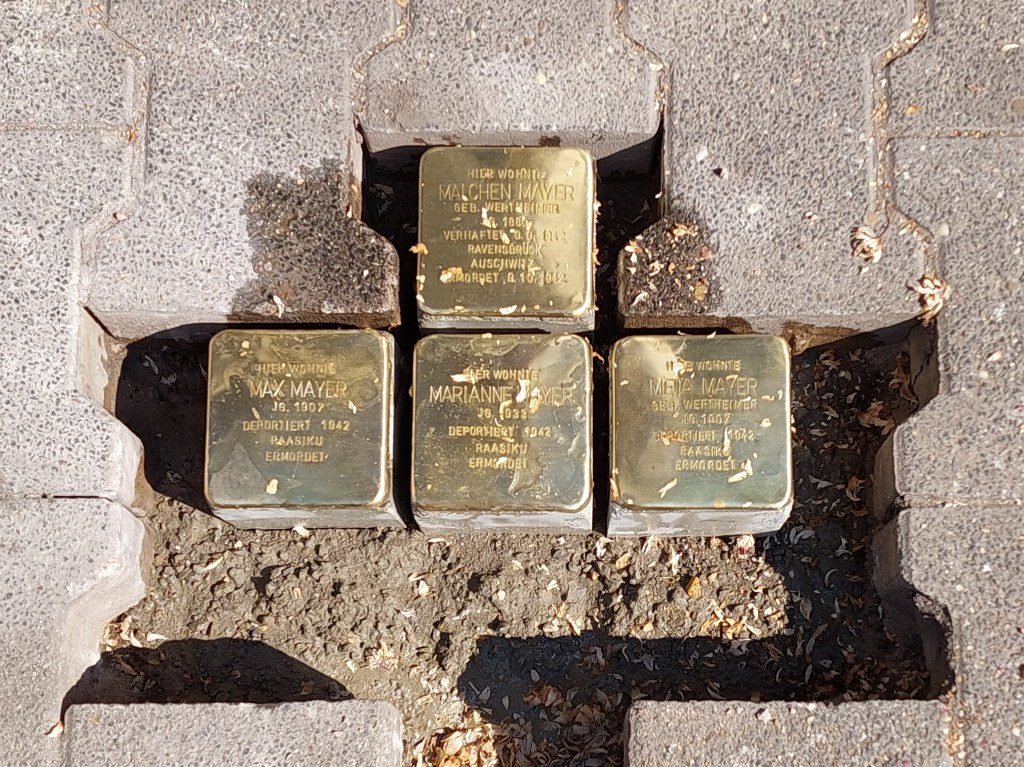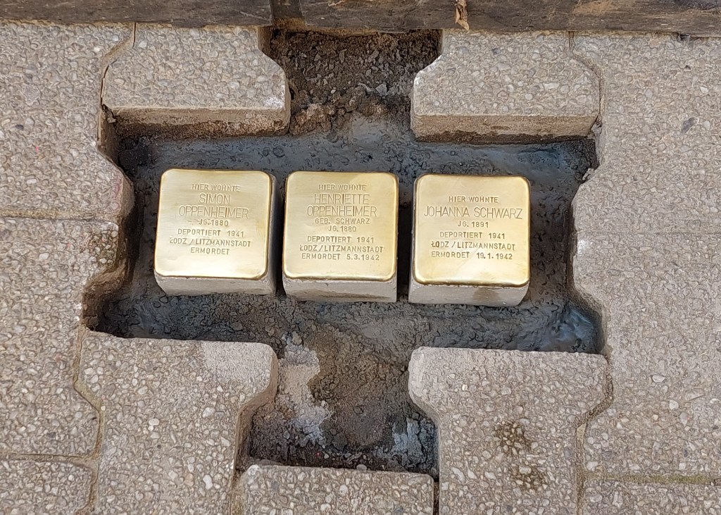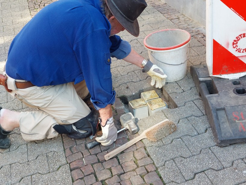 Man kann als Normalbürger auch in diese Archive gehen und im Gedenkbuch nachschauen; im Bundesarchiv gibt es auch viele Informationen, z.B. Unterlagen von Konzentrationslagern. Beim Standesamt in Alzey kann kann man ebenfalls nachschauen, aber vieles ist einfach abhanden gekommen. Die Familie Baum war zum Beispiel seit dem 17. Jahrhundert in Alzey ansässig und dadurch richtig einheimische Alzeyer Bürger. Eine Nachfahrin der Familie Baum war heute morgen bei der Verlegung mit dabei. Andere jüdische Familien, wie zum Beispiel die Familie Oppenheimer, hatten keine Kinder und sind völlig ausgelöscht. Viele sind auch in den Deportations-Zügen umgekommen. Aber ein paar kleine Anekdoten, wie z.B., dass Regine Schloss viel Appetit hatte, lassen die Personen lebendig wirken und erinnern uns daran, dass diese Menschen eben ganz normale Menschen waren. Das hilft zusätzlich, sich an diese Menschen und ihr Leben zu erinnern.