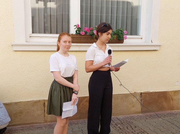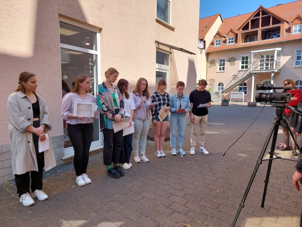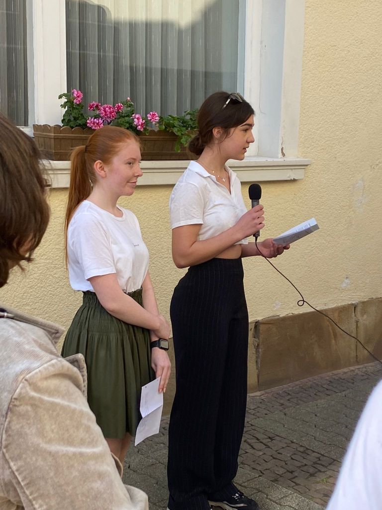 Danach konnte ich mit unserer AG Courage noch ein kleines Interview zur Verlegung und ihren Gedanken zu dem ganzen Thema erhaschen. Im Gespräch mit mir waren Frau Schwede-Botheroyd, Darja Scherbina, Ivie Schütz, Justine Koenen, Luzie Braun, Mia Singer und Leonie Schweickert.