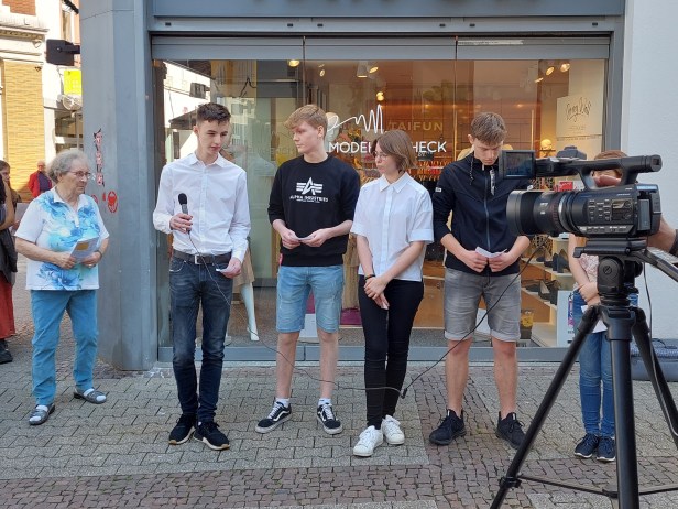 Wir konnten im Januar überhaupt erst mit unserer AG-Arbeit weitermachen, weil Corona uns stark hinderte. Da hat uns Frau Schwede-Botheroyd das Projekt vorgestellt und wir waren alle interessiert. An den Texten haben wir erst seit den letzten drei oder vier Wochen gearbeitet. Frau Rosenau hat uns geholfen und war auch bei uns an der Schule, um uns ihre Archivarbeit zu den Personen, die wir vorstellen sollten, zu präsentieren. Da hatte sie auch Archivmaterial vom Landes- und Bundesarchiv und auch aus den USA. Das war wirklich eine schwierige Arbeit, weil viel Material zerstört oder auch verstreut war. Es gibt dadurch auch eine große Dunkelziffer der Toten in der Zeit. Der Sohn der Familie Weiner ist zum Beispiel verschwunden. Aber ja, wir haben eben über die fünf Personen zu den Steinen, die wir vorgestellt haben, genauer recherchiert.